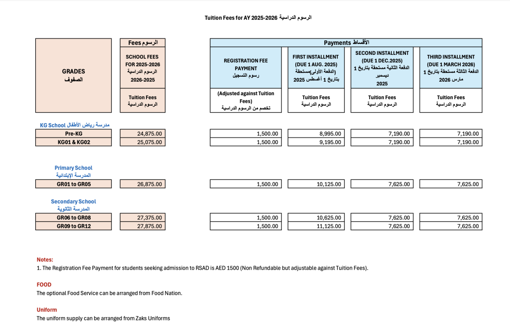 | Tuition fees* | 35,500 AED (Pre KG, KG 1 and KG 2) 37,500 AED (Grade 1 – Grade 12) |